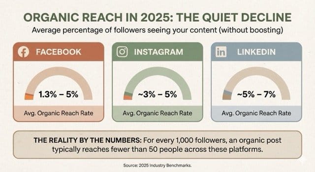 We are seeing a historic dip in organic reach across the “Big Three” platforms. If you have 1,000 followers, here is the harsh reality of how many people actually see your non-boosted posts: